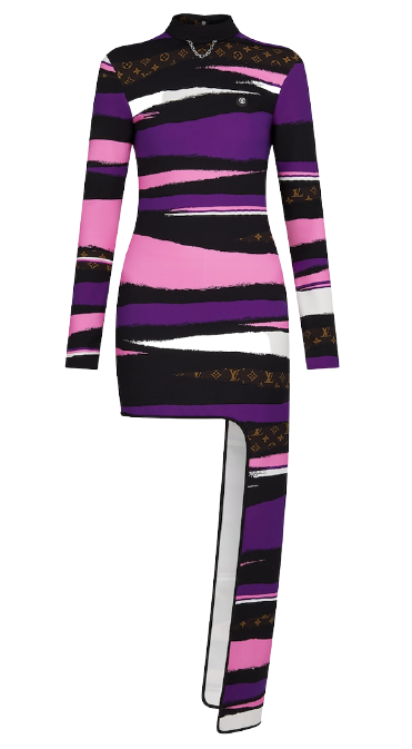 Amina Muaddi takes us to Cannes in a Louis Vuitton look. Wearing new season Vuitton in their asymmetrical ‘Macro Epi Dress’, which features a stripe design with shades of pink, purple, black, white and hints of the brand’s iconic monogram design. With SS21 being the year of groovy patterns and cutouts – this one’s essential.