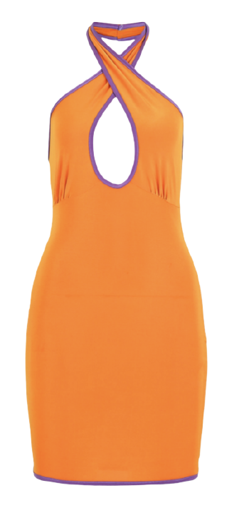 A new colour combination we’re loving is orange and lilac. Wolfie Cindy wears a halter neck mini dress in a neon shade with contrasting purple seams. One of the most popular silhouettes of the season with its asymmetric feel.