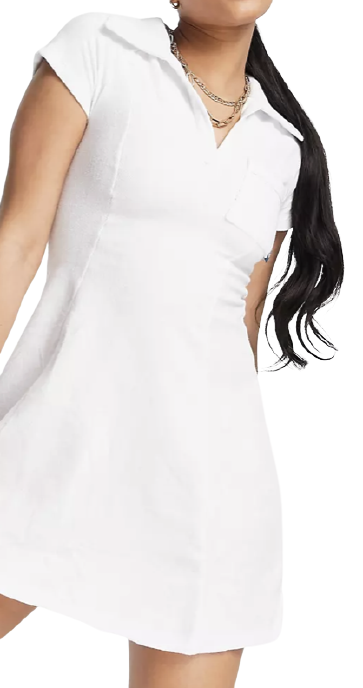 Another trend for SS21 is towelling material. Jamilla Strand wears the ‘Alexa Dress’ by With Jean which is in a bold electric blue colour. The mini dress features button down detailing, a ruched waist and a polo-style collar all in a shimmery towelling fabric.