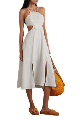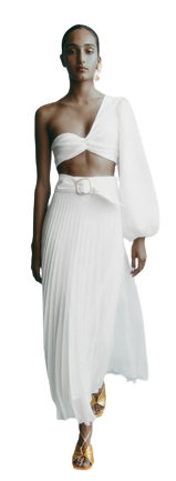 Neutrals with a statement. In a rustic wedding, there are many natural and wooden elements, so you can play with textures and have a more relaxed atmosphere. The stunning piece was part of Jacquemus’ fall collection named ‘Le Papier’, which mainly incorporated whites and creams with linen dominating, making it blend beautifully into the scenery.