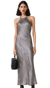 In Eckhaus Latta’s collection, sheer, glittery knits were fused with sheer, silk blouses and dresses, some with slashes and others with slits that exposed some skin. This low-cut dress makes for an edgy and sultry look and you are sure to stand out bright in this metallic shine.